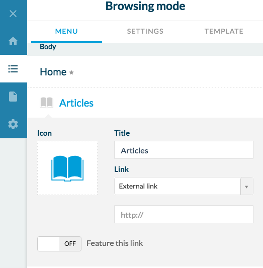 3. Vá ao menu Home e poderá adicionar um link quer no cabeçalho junto ao título, quer na lista de conteúdo, na aba Estrutura, clickando no botão verde "+".