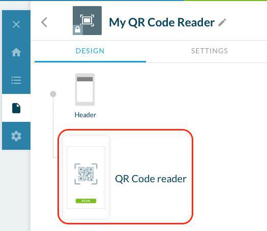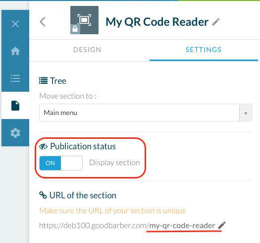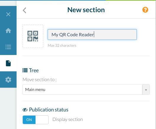 Para adicionar uma seção leitor de código QR para a sua aplicação, no seu back-office acesse o menu Construtor > Seções > Adicionar seção (botão verde "+") e depois escolha a seção QR Code.