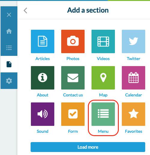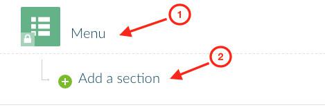 No menu Seções do Construtor, clique no sinal "+", escolha a seção Menu, dê-lhe um título e clique Adicionar.