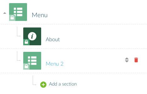 Pode agora adicionar seções sob o Menu usando o sinal "+" para adicionar um novo nível de navegação ao seu app.