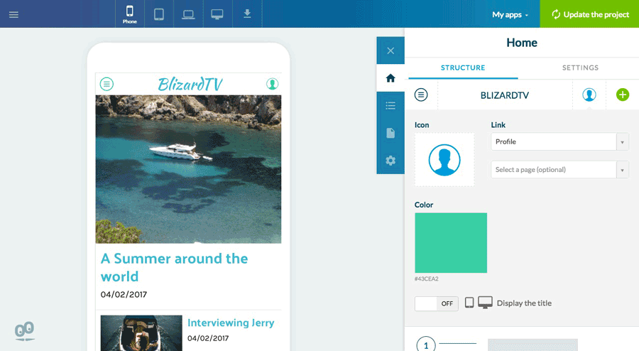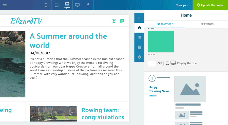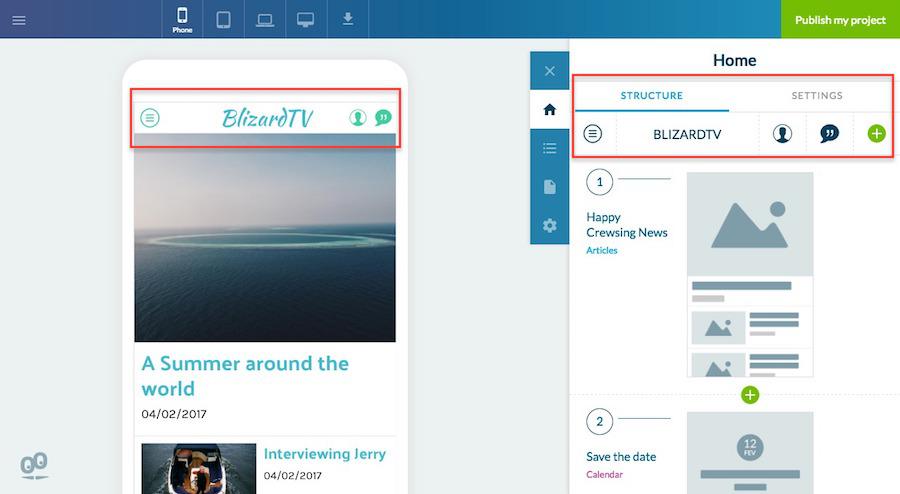 A configuração do cabeçalho geral pode ser feita a partir do menu Home do Construtor, a partir das abas "Estrutura" e "Configurações".