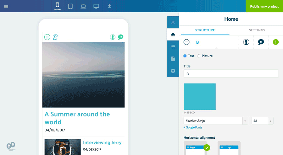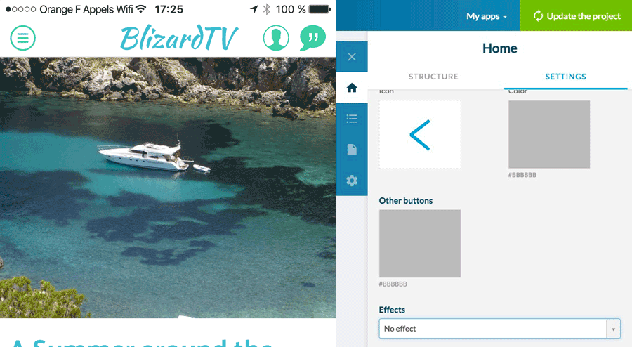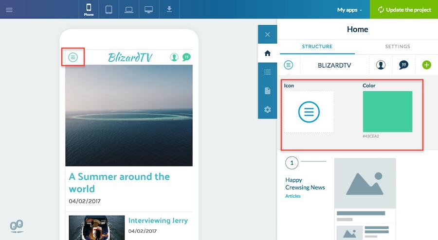 Para acessar conteúdo com os Modos de Navegação Swipe, Little Swipe, Grid, Slate e "Do zero", um botão de menu parece no cabeçalho. Você pode clicar neste botão, a partir da aba Estrutura, para modificar o seu design.