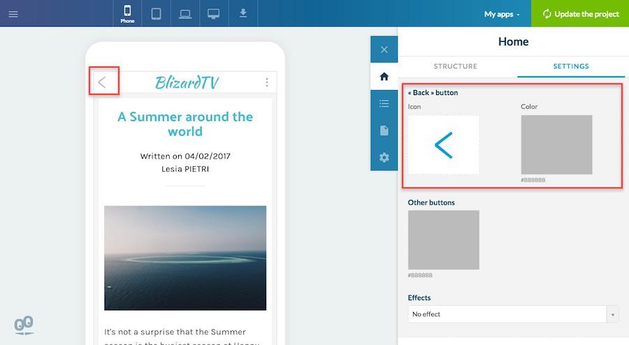 Na aba Configurações > Zona do título, você pode definir o design do botão "Voltar", usado para voltar às páginas anteriores dentro do app.