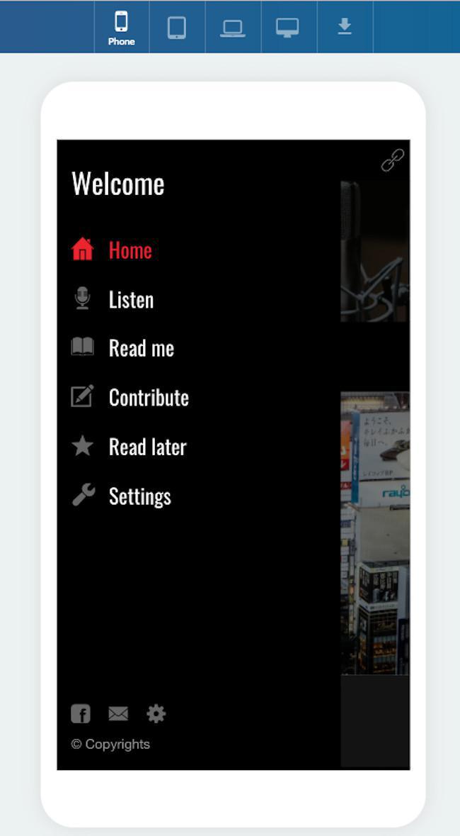 É desta forma que o seu app aparecerá num celular. Contudo, tenha em mente que o design do seu app é automaticamente adaptado para cada tamanho de tela, por isso o app real pode aparecer um pouco diferente, consoante o tamanho da tela em que é exibido.