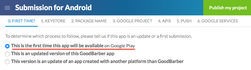Na maioria dos casos, se for a primeira vez que o app é publicado, você deve selecionar a primeira opção: "Esta é a primeira vez que publico o app no Google Play".