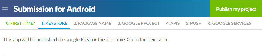 Uma vez testado o seu app, volte a esta página (acesse ela em Publicar > Publicação > Android).
