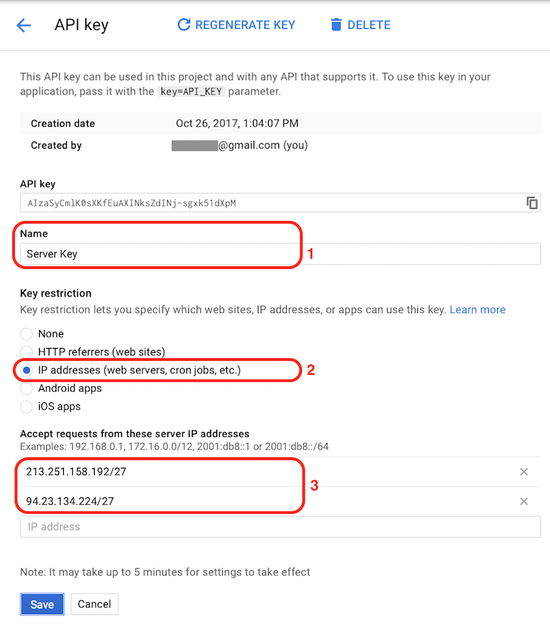 2: Em restrições da Key, selecione a opção Endereço de IP (web servers, cron jobs, etc.)