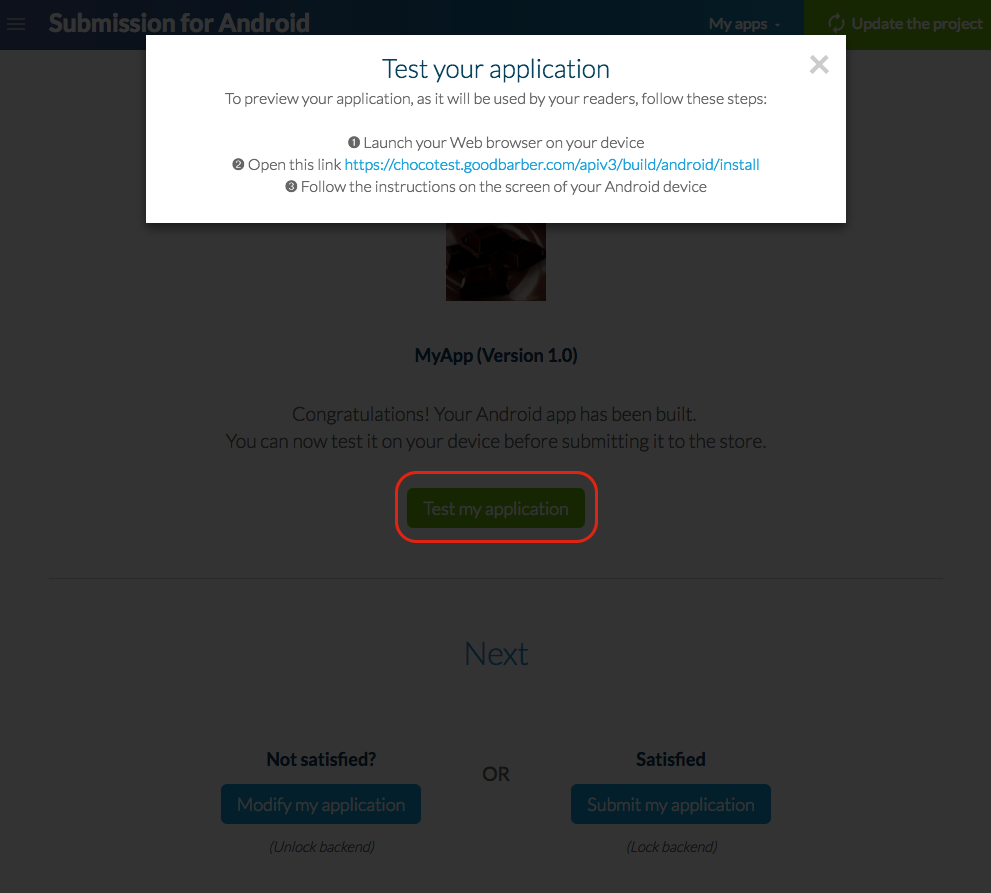 Clique no botão "Testar o meu aplicativo" no texto e siga as instruções exibidas na janela pop-up.