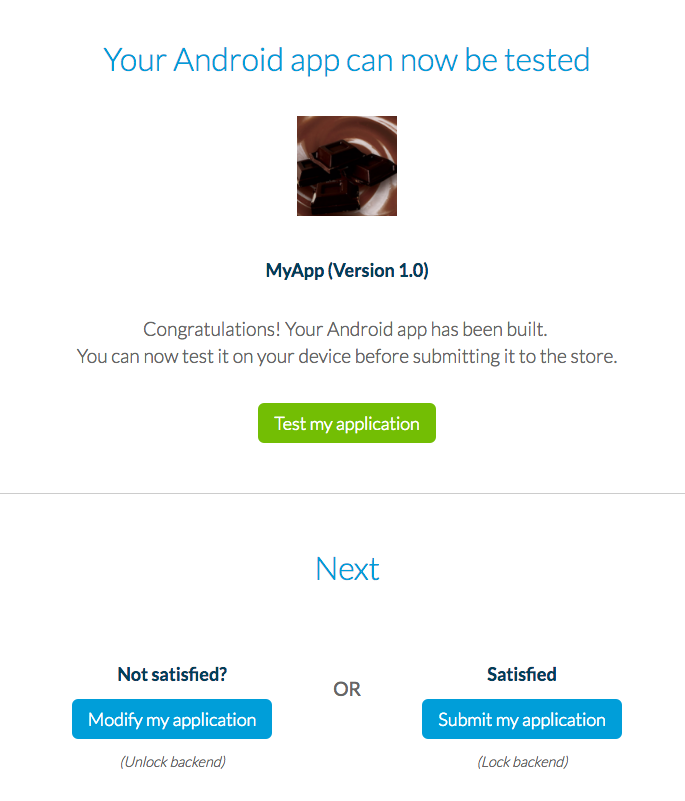 Depois de alguns minutos, uma nova tela aparecerá para informar que seu aplicativo Android está pronto para ser testado.