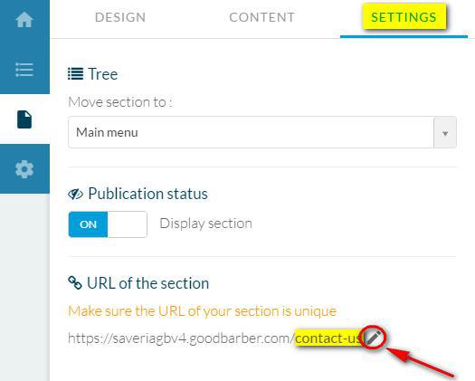 Acesse a aba Configurações da sua seção, depois clique na pequena caneta para que possa editar o slug da URL da sua seção.