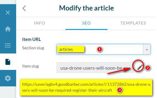 1/ se o seu artigo é mostrado em várias seções do seu app, escolha a seção que será usada na URL do seu artigo.
