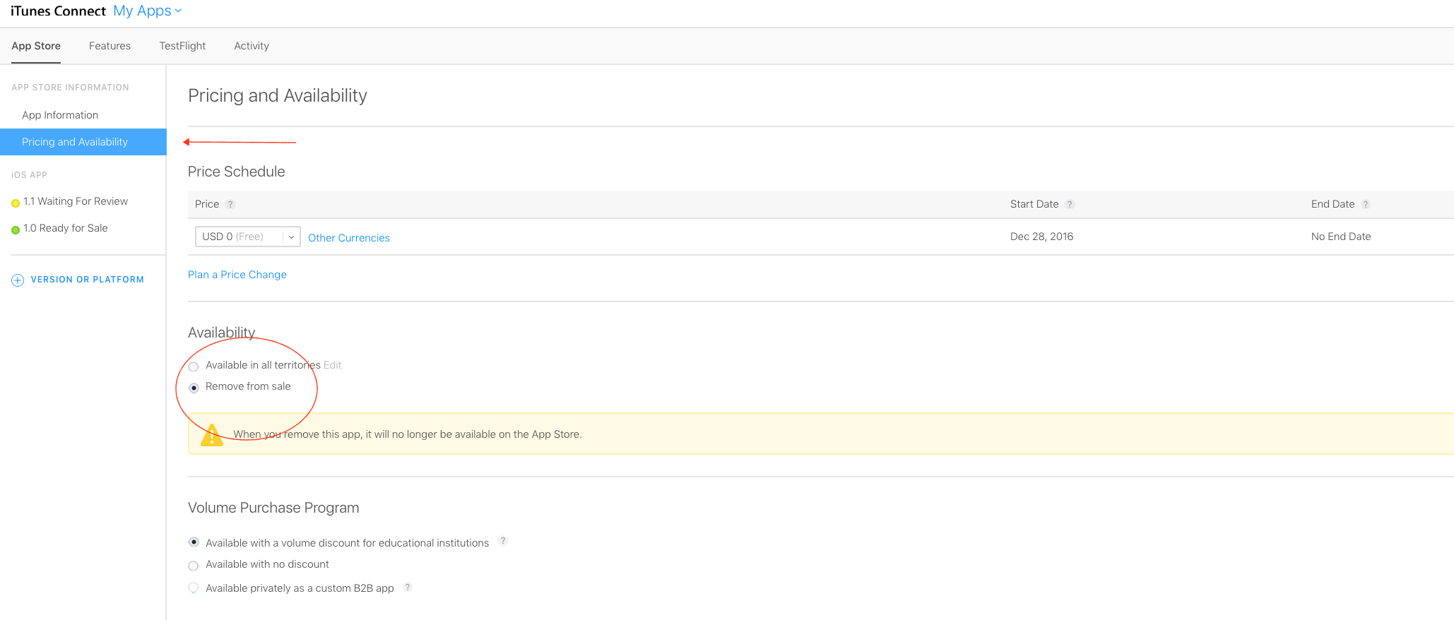 5. Sob a secção "Disponibilidade" selecione a opção "Remover de venda";