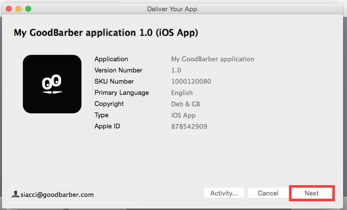 Clique em "Next" para fazer upload de seu aplicativo para a Apple.