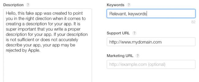 - Keywords: Essas são as palavras-chave que permitirão que as pessoas a encontrem o seu aplicativo mais facilmente na loja