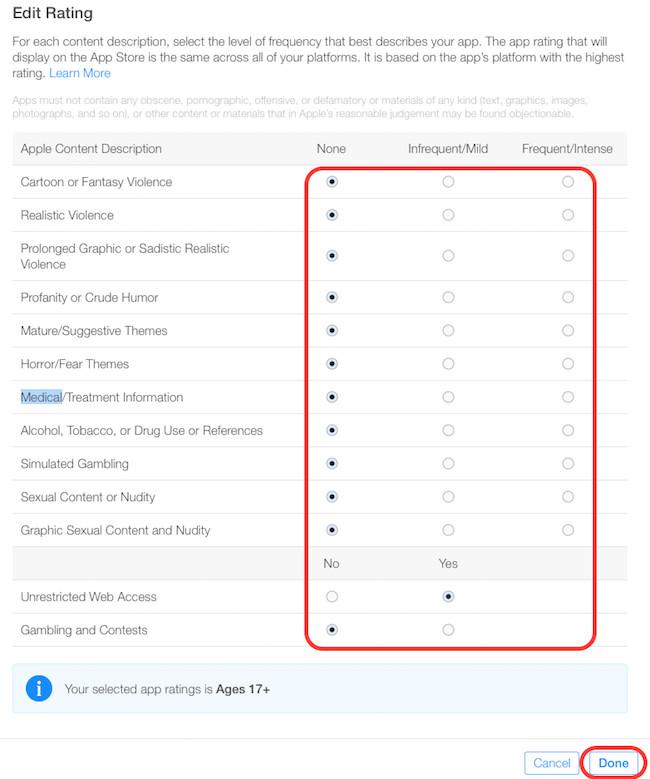 - Rating: Clique em Editar. Você deve especificar o conteúdo do seu aplicativo dentro de cada categoria.