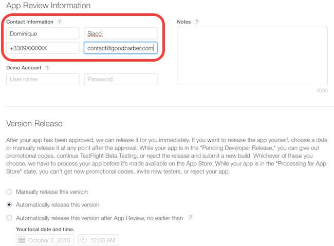 - Contact information: Seu primeiro nome, sobrenome, endereço de email e número de telefone (prefixo do país, ou seja, para a Brasil +55), caso a Apple deseje entrar em contato sobre o processo de revisão de seu app.
